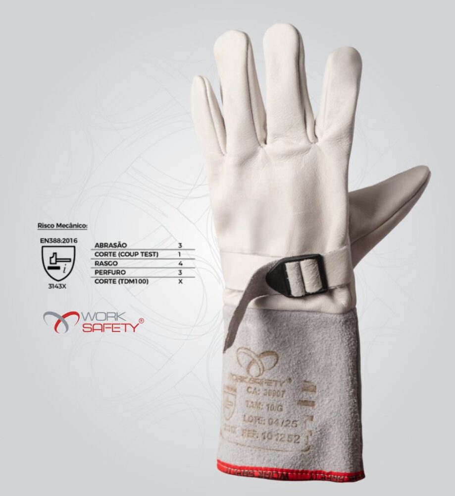 Luva de segurança, modelo montepellier, confeccionada em vaqueta na palma, dedos e dorso; tira em vaqueta no dorso e fivela plástica para ajustes; reforço meia lua em vaqueta no punho; punho em raspa.