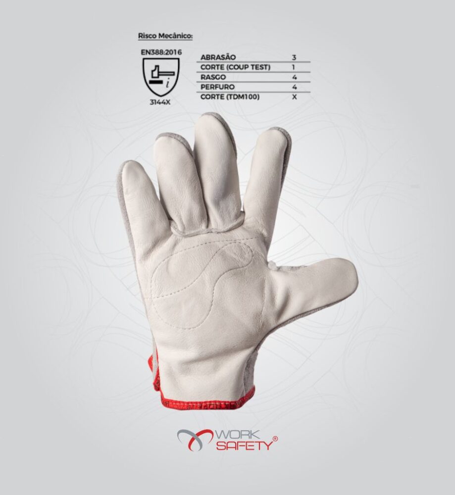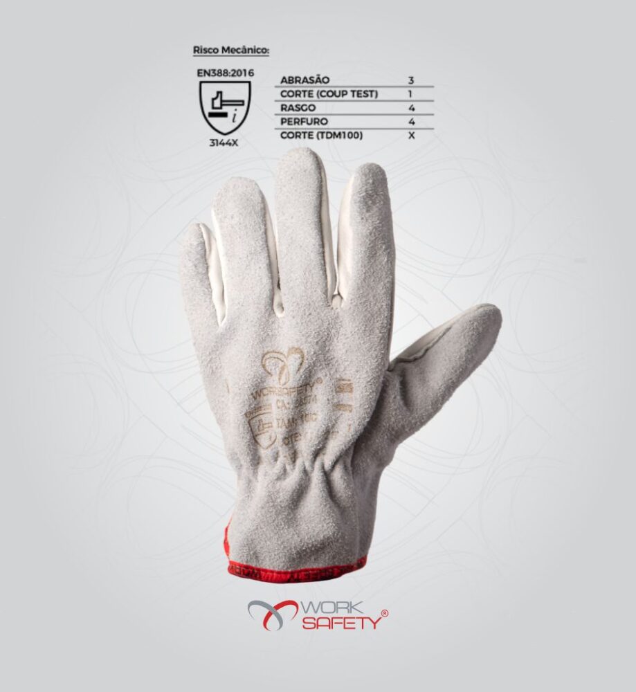 Luva de segurança confeccionada em vaqueta, modelo montepellier, reforço interno em vaqueta na palma, dorso em raspa, elástico no punho.